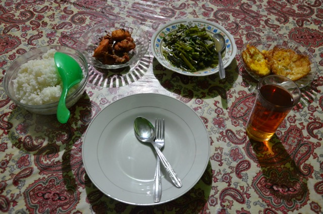 夕食は、チキン、空心菜の炒め物、ナシ(ごはん)、卵焼き、そして砂糖がたっぷりと入った紅茶だ。チキンは、日本の唐揚げに似た味付けで、とても美味しい。