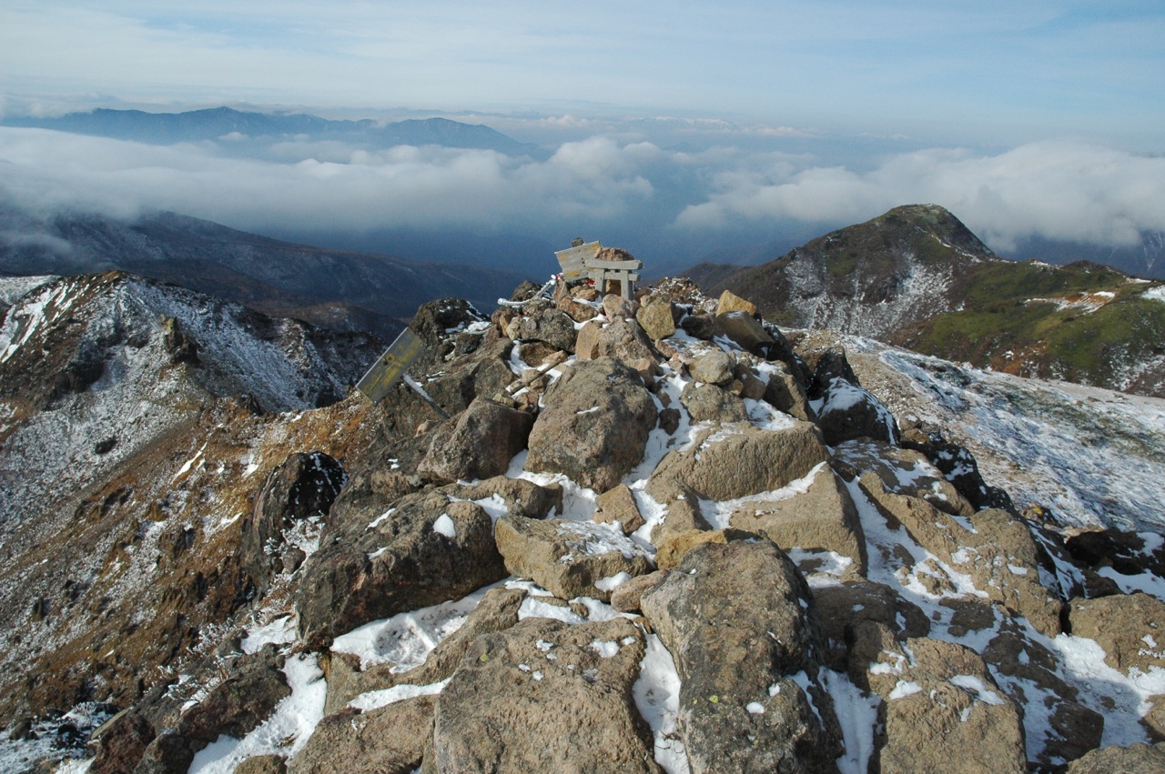 元来た道を引き返し、気を取り直して山頂を目指す。岩でガラガラの道を登っていき、鳥居をくぐると、小さな祠のある茶臼岳山頂に着いた。